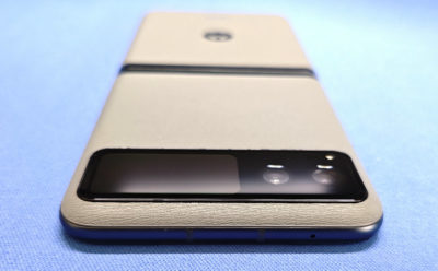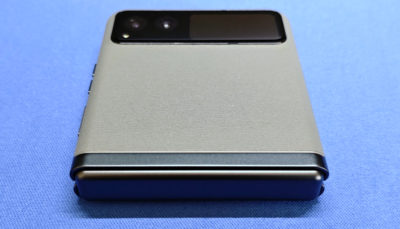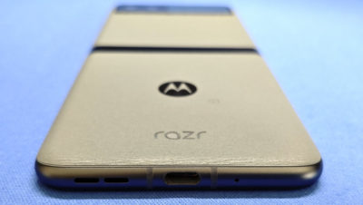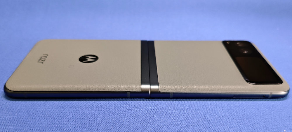 上側エッジはマイク穴のみ。アウトカメラは2眼で、その横に約1.5インチなアウトディスプレイがあります。より新しい razr だとアウトディスプレイが巨大化して、折りたたんだ状態で色々操作できますが・・・サブ端末として使う予定なので、小さいアウトディスプレイでも十分かも・・・という判断。一応タッチ操作して通知見たりできます。