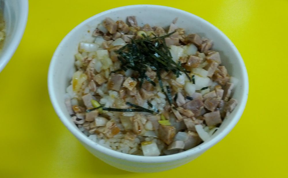 オマケにチャーシュー丼を頼んでみました。250円。こちらはタマネギの甘みと甘辛のタレが割りと美味しくて好みですねー。でも、チャーシューはあるのか無いのかわからないほど控えめな味でして・・・