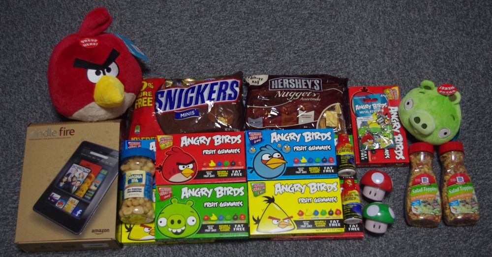 Kindle 炎はY栗先生に。お菓子の類は職場の皆様に配りました。怒鳥のヌイグルミはM橋氏などからのリクエスト。