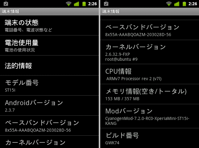 システム情報はこんな感じ。Android バージョンは 2.3.7 です。コチラには、BASEBAND は バージョン64 が必要だと書かれていますが、まだ 56 のままです。