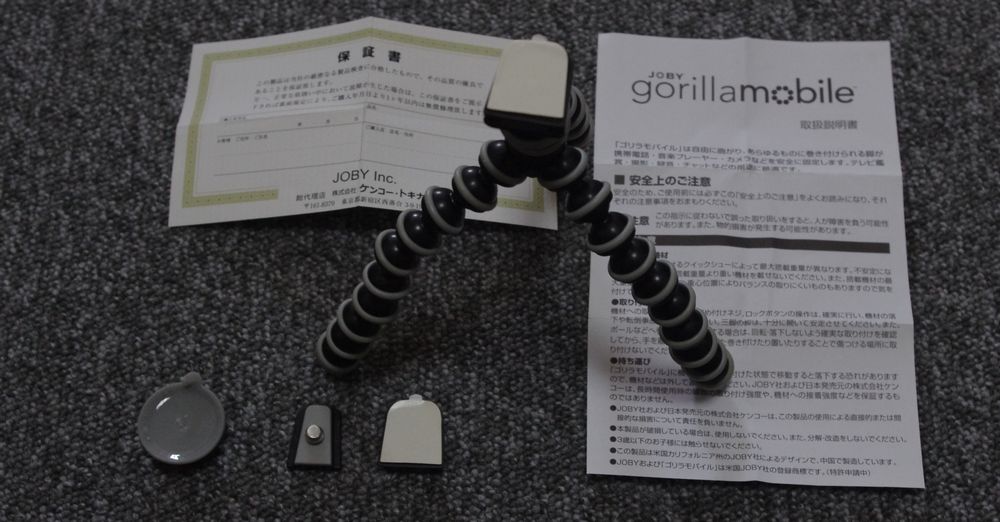 gorilla pod のモバイル機器バージョン。カメラ用のアタッチメントも付いていますが、強力両面テープなアタッチメント2個と、ラバーなアタッチメントと、接続部分が充実しているのが特徴。