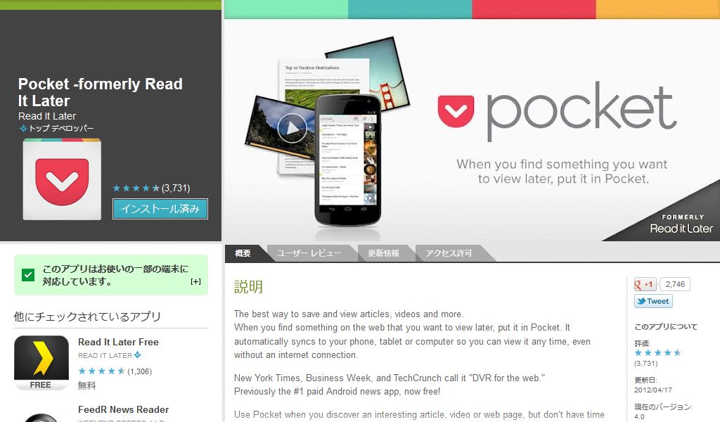 んでね・・・私はこのサービスが気に入っていたのと、以前 Android アプリの Read it later Pro が安売りされていたので、ちゃんとお金を支払って購入したんですが・・・