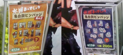 名台詞ピンバッジのガチャは3種類。2つはどうでしょう。1つは on ちゃんでした。