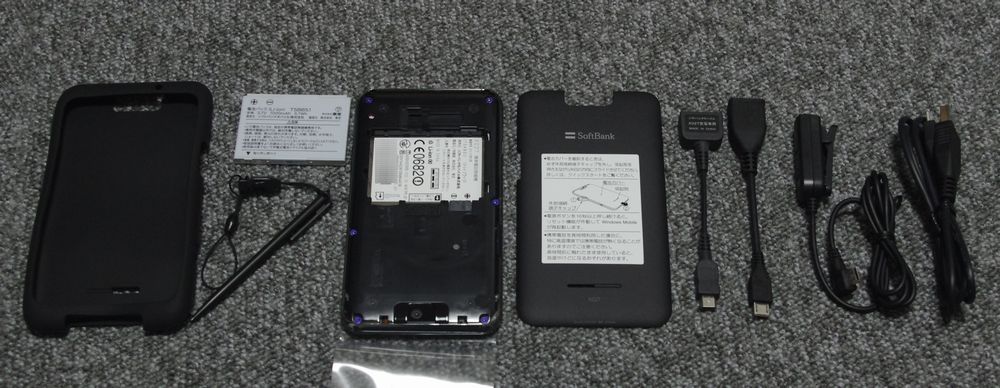 左側からシリコンカバー、バッテリー、スタイラスペン、本体、バッテリーカバー、ケータイ充電コネクタ→microUSB変換、USBホスト用ケーブル、イヤホン変換ケーブル、PC接続用microUSBケーブルです。