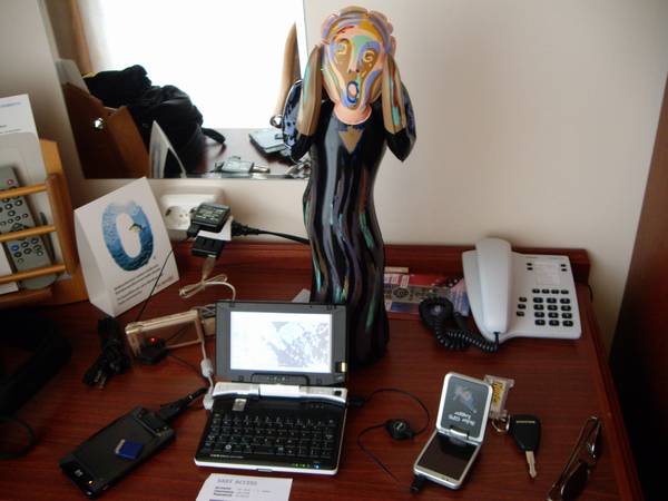 色々な持ち物の電池がなくなりかけているので一気に充電開始。携帯、GPS、PDA(hx4700)、デジカメ2台にノートPCと、広げると毎度ばかばかしい光景が机に広がります・・・が、いつの旅行もこんなもんです。さらに iPod とか Palm とかもカバンに入ってたりします。電気がなくなると困ってしまうので、充電関連は常に満載。USBのクルクルケーブルとかで小型化とトランスの共用化はしているものの、やっぱりかさばります。もっと製品レベルで共通化して欲しいものです・・・