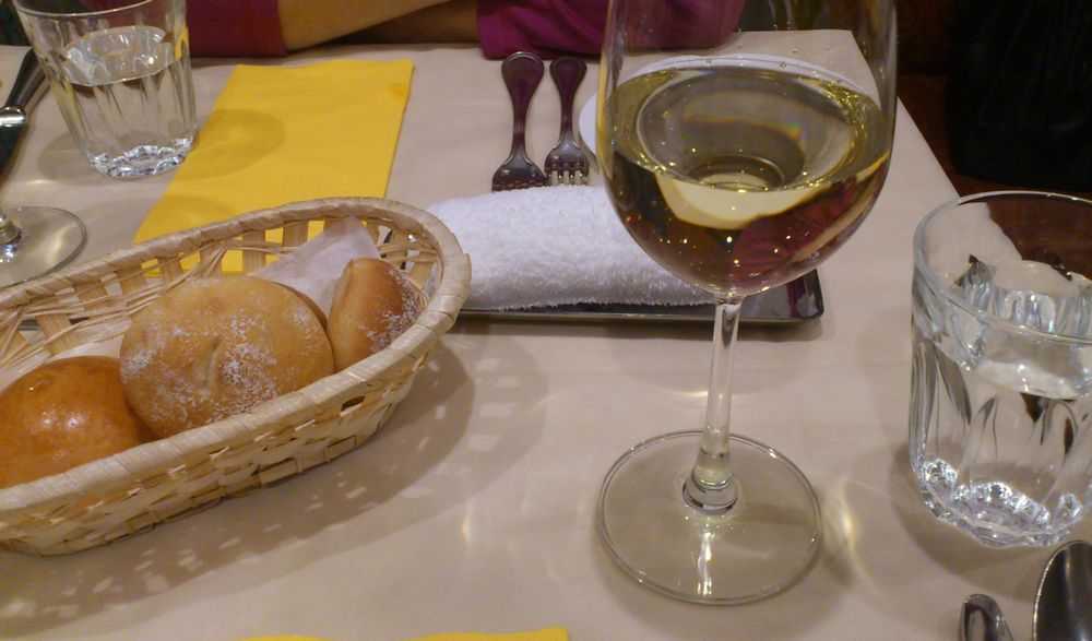 ワインはソーヴィニヨン・ブラン。バケットはほんのり暖かくて美味しいです。