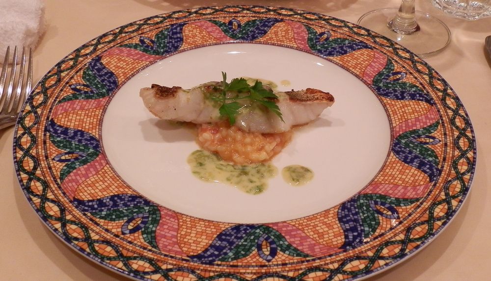 魚料理はハタ。下にトマトリゾットが敷かれてまして、これが濃厚で絶品です♪ ハタも皮はパリっと、身はシッカリと、そしてジューシー。ソースは青海苔と白ワインベース。これまた白ワインと合うのなんの・・・