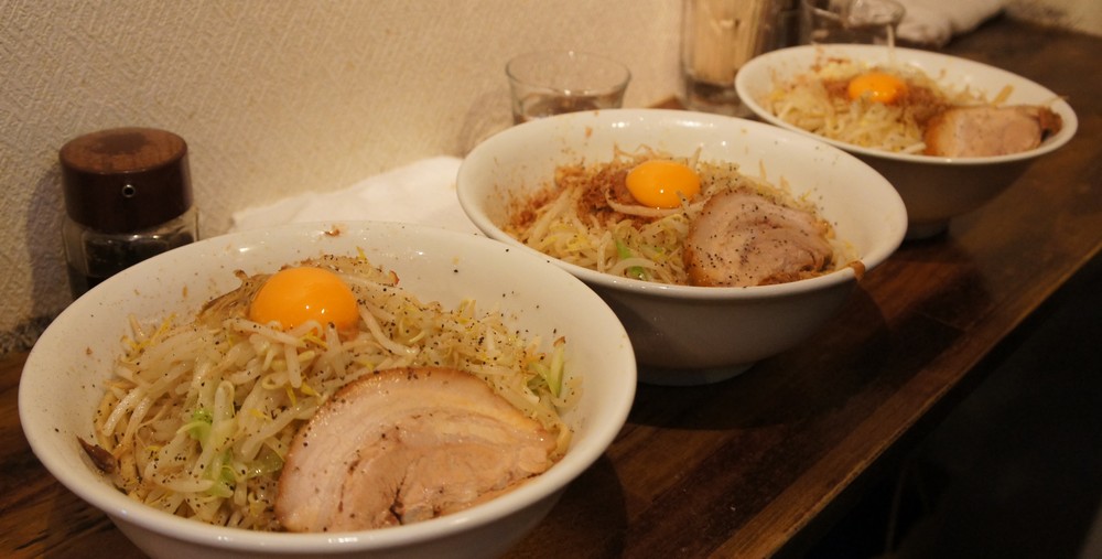 まぜそばジェットストリームアタック(爆)。手前が私の塩大盛り、中央が醤油大盛り、奥が醤油普通盛りです。
