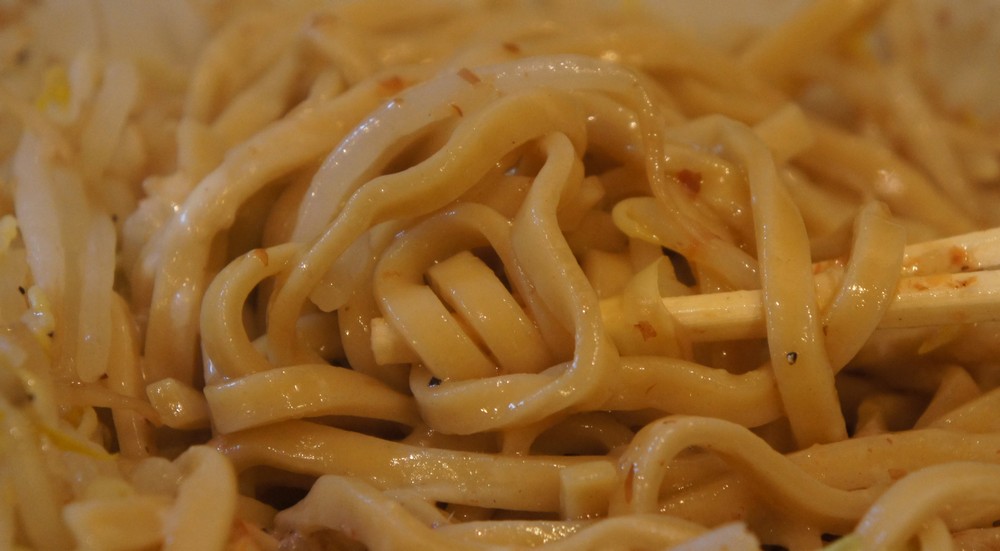 混ぜ混ぜしてみました。二郎を思い出す太麺ですが、スープが少ないのでいつまでもゴッツリとしており、結構食べるのに疲れます。