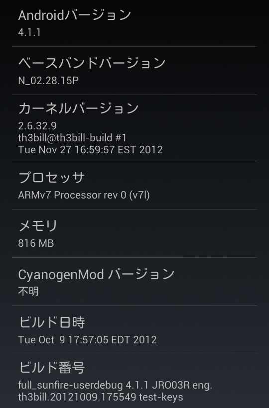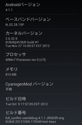 そんなわけで、我が家の布団は CM10 になりました。ベースは 4.1.1 な Jelly Bean。古い機種とはいえ、DualCore プロセッサなので結構快適な操作感です。