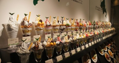 お店のディスプレイはパフェがズラーリ!! とはいえ、奥の半分は鏡ですけどね♪ 上段がノーマルサイズ、下段がスモールサイズです。
