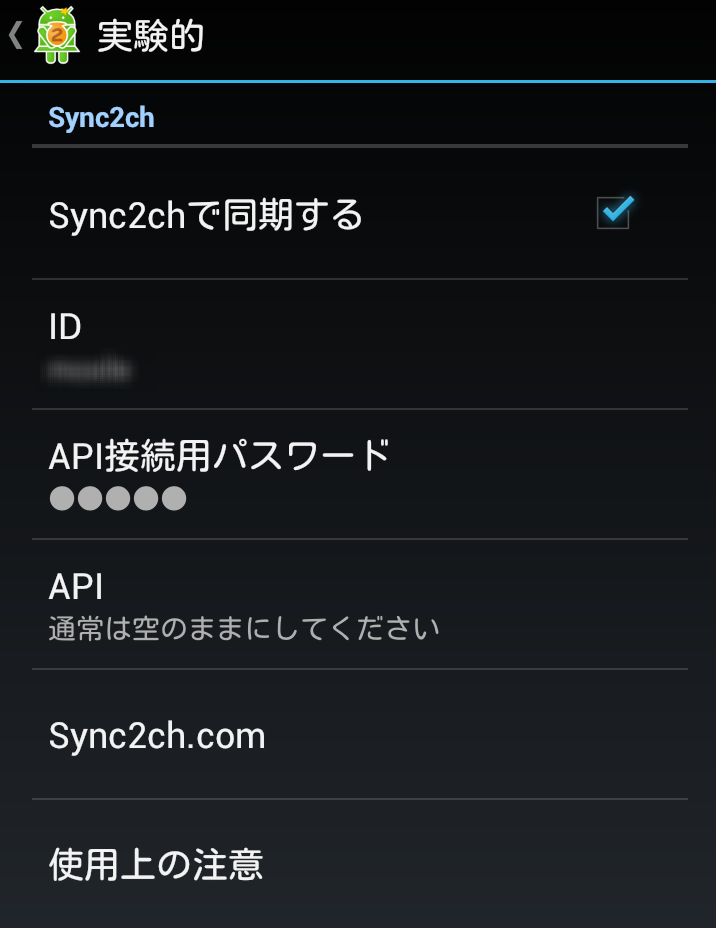 んで、2chMate のメニューの「実験的」にある「Sync2ch で同期する」にチェック。ID と API 接続用パスワードを登録。これを複数のデバイスでやっておきます。