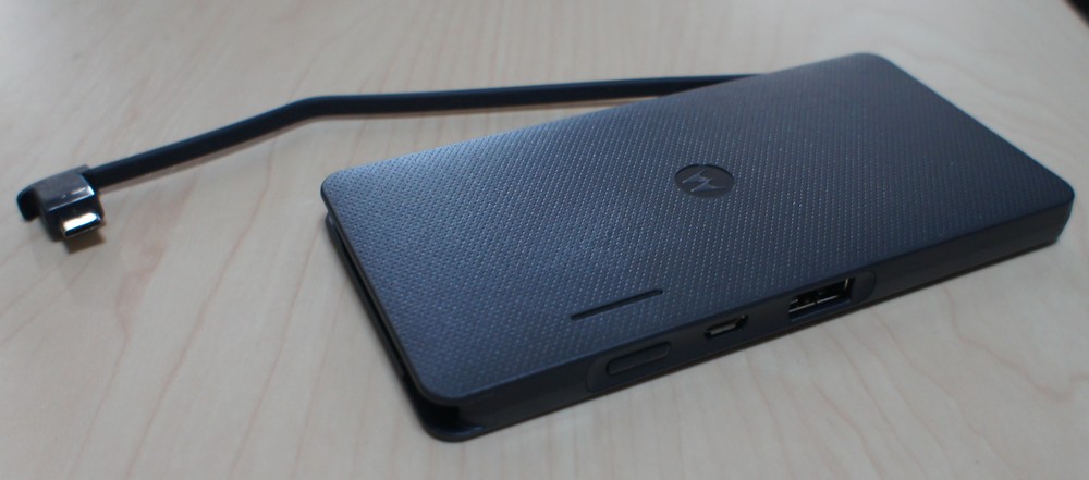 本体にはスイッチと、MicroUSB (充電用の入力)、通常の USB (出力用)、そして周囲に巻き付いて格納できる MicroUSB ケーブル(出力用)が付いております。