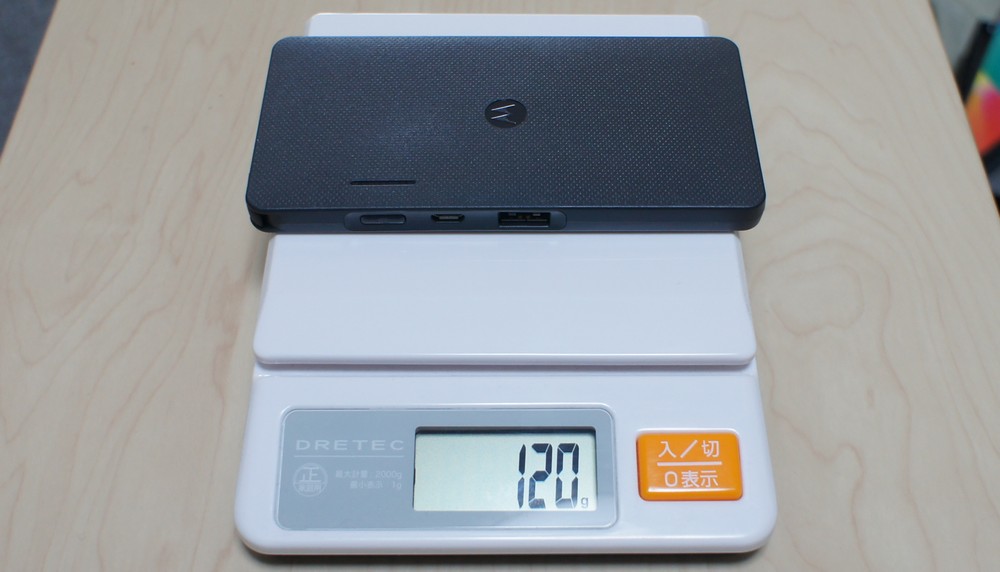 実測で 120g でした。割とフツーなスマフォ1台分といったところでしょうか。薄いのでカバンの中でジャマにならないかも。