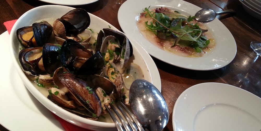 アサリとムール貝のソテー盛合せと鮮魚のカルパッチョ。