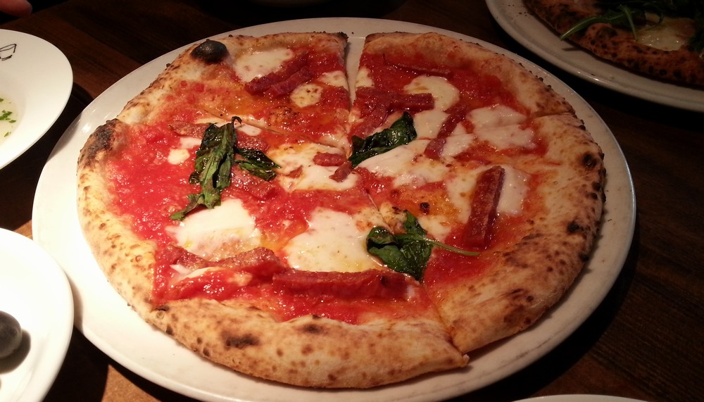 店内に釜がありますので・・・1枚目は辛口サラミと唐辛子のピッツァ。サラミが激旨!!