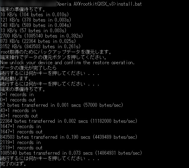 そして、コマンドプロンプトから install.bat を実行して指示通りに。これにて root が取れたはずなんです。