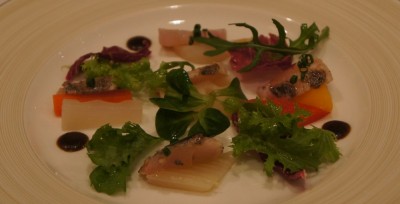 続いては太刀魚のカルパッチョ。黒い点に見えるところは、海苔の佃煮。フレンチなのに、少し和のテイストが入って美味。付け合わせの野菜にもそれぞれ味が付いていて手の込んだ一皿になっております。