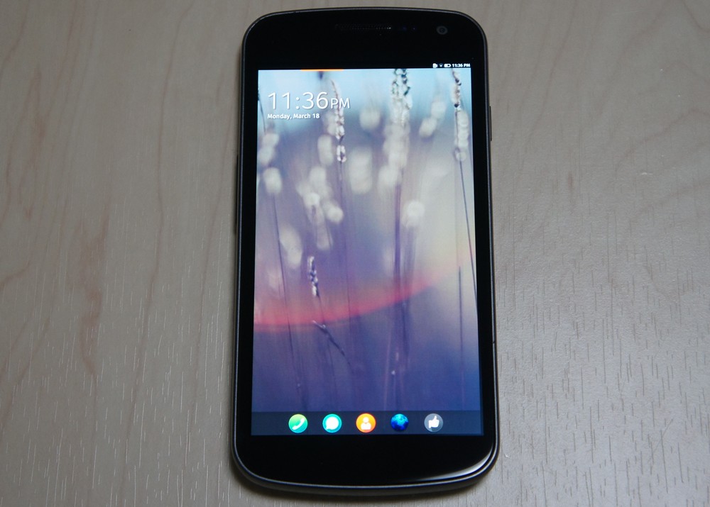ホーム画面はこんな感じです。下のドックに並ぶアイコンは、左から電話、ツイート、電話帳、ブラウザ、Facebook といった感じかな。