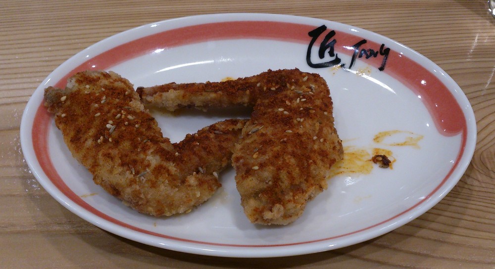 新メニューとなる手羽先揚げがまず出てきました。辛くて美味しい♪ とってもジューシー。でも、手や口の周りが油まみれになります・・・