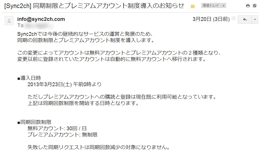 私の利用形態なら、1日30回でも困らなそうなので、このまま無料アカウントで通したいと思います。後はですね、2ch Mate がスレの同期と Sync2ch の同期を別々に行えるようにしてくれれば安心かなー。