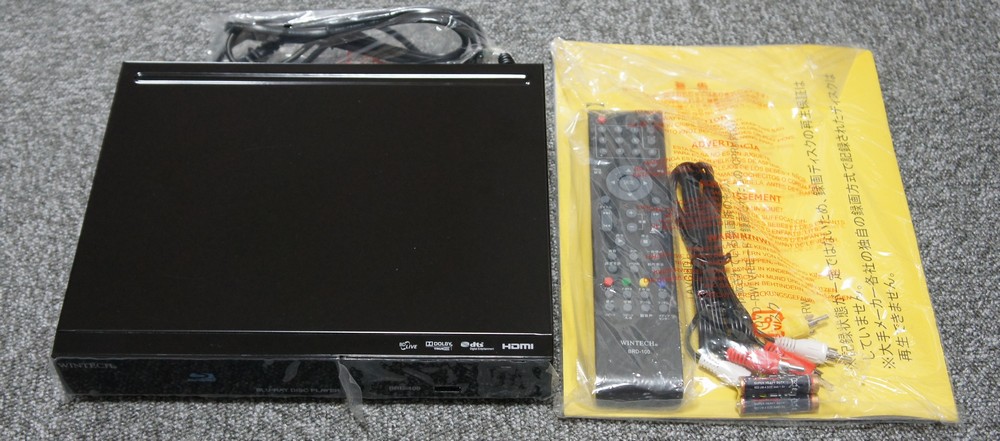 WINTECH というブランドの BRD-100 というモデル。まぁ、中華家電ってヤツですな。付属品はリモコンとリモコン用の単四電池、RCA ケーブル・・・って、HDMI ケーブルじゃないんか・・・