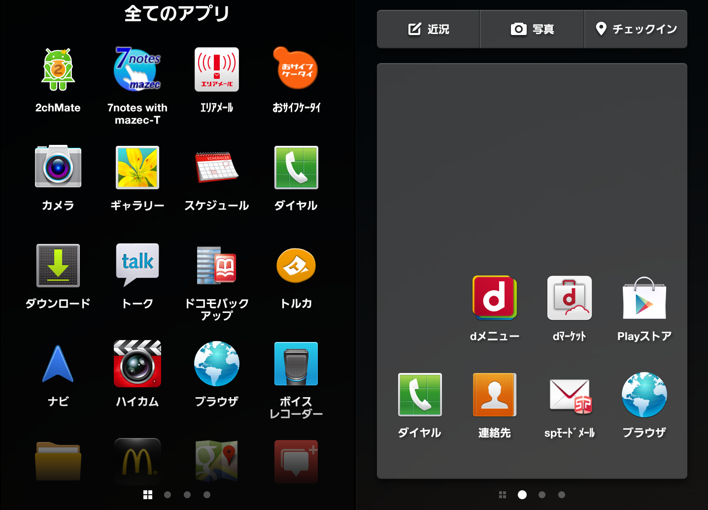 アプリの呼び出しは、メニューからアプリを選択するか、後述の自分アイコンから出てくるボタンで。一応3画面のランチャー画面(Widget が置けない!!)と、一番左に一覧。んー、使いにくい!!