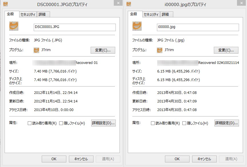 上は同じ JPEG ファイルの復旧結果。いずれも画像としては OK なのですが、ファイルサイズが異なります。Recuva の方はファイル名も正しく復旧できているし、ファイルサイズも大きい。でも、Zero Assumption Recovery の方は動画も復旧できました。いずれもフォルダ構成は復旧できません。