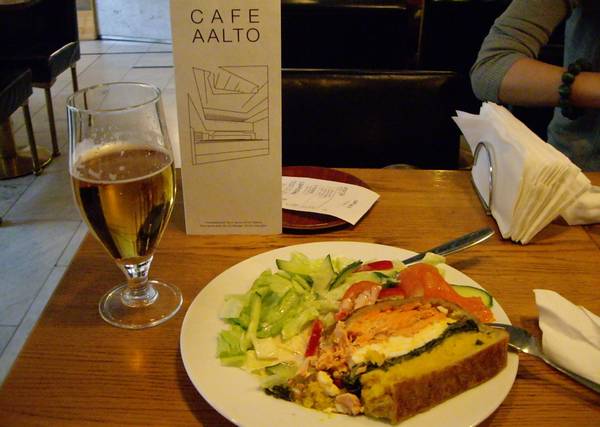 頼んだサーモンパイはサーモン、タマゴ、ほうれん草、ライスを層状に重ねてパイでくるんだもののスライス。結構食べ応えのある量ですが美味しいです。なんか、都会的な味で、フィンランド料理とも一味違います。奥様注文のサーモンサラダのサーモンもちょっぴり頂きましたが、とても脂が乗ってて美味しいです。