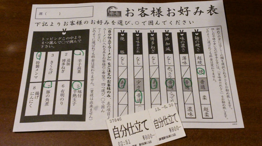 このお店は、お好み表を記入してカスタマイズするのがデフォルトらしい。