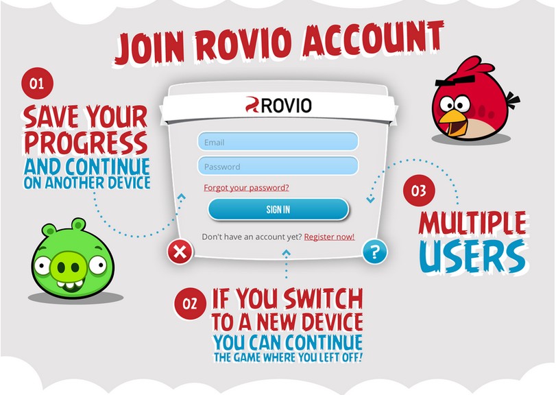 あと、Rovio アカウントも開始。これで Android 版と iOS 版でゲームデータを共有できるそうですが、今のところ無印な Angry Birds と The Croods のみ。