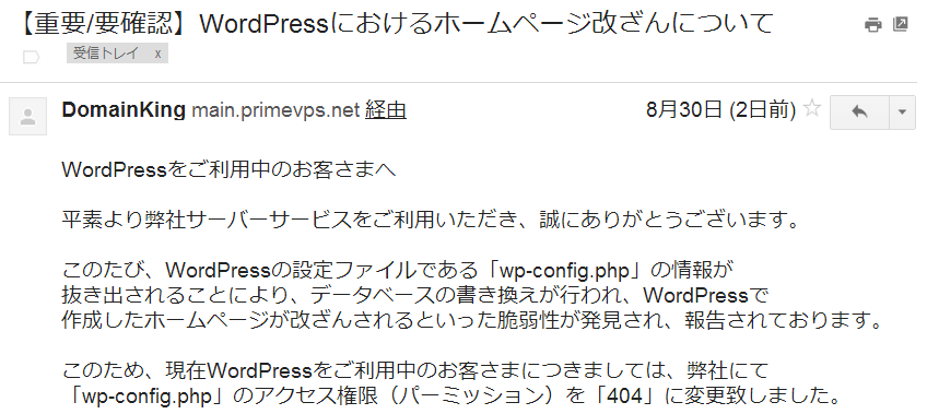 私の使っているレンタルサーバからも連絡が来ました。一応パーミッションは以前から 404 にしていましたけどね・・・