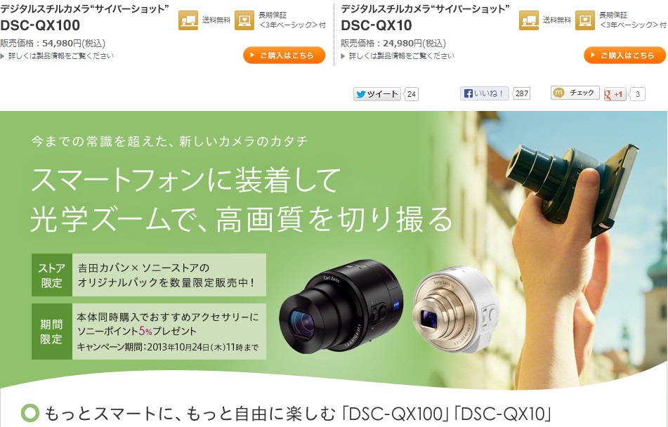 Posted in Gadgets, ひとりごと あのレンズタイプカメラは 10/25 発売開始!! Author: 管理人 Published Date: 2013/09/13 Leave a Comment on あのレンズタイプカメラは 10/25 発売開始!! いやはや、本当に売るんですね・・・ 見ているうちに、徐々に欲しいゾ熱が上昇中。 さーて、マジで入手するか・・・いや、むしろ QX10 と QX100 どっちにするかで悩み始めた(笑)。 既にソニーストアでは予約受付中。やっぱりよりコンパクトな QX10 で 24,800円・・・コッチかなぁ(笑)。 こういうのを、Xperia mini や Ray 等の小型スマフォに付けたりしたら、現状の NEX よりもコンパクト・・・だったりするかしら!? Author: 管理人