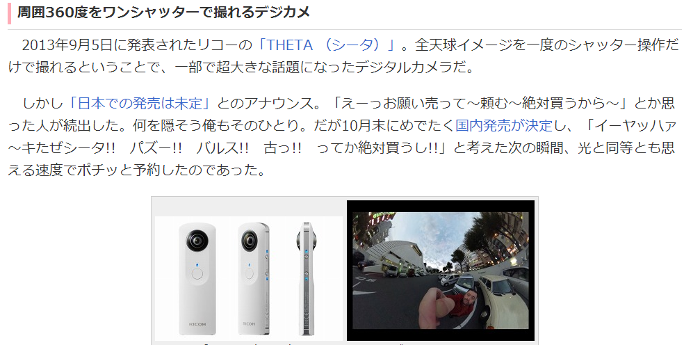 一つ目はスタパさんの THETA の記事。全天球カメラって面白そうだな・・・でも、初物はきっと残念な点があって、ブラッシュアップされた第二世代辺りが「買い」なんだろうな・・・