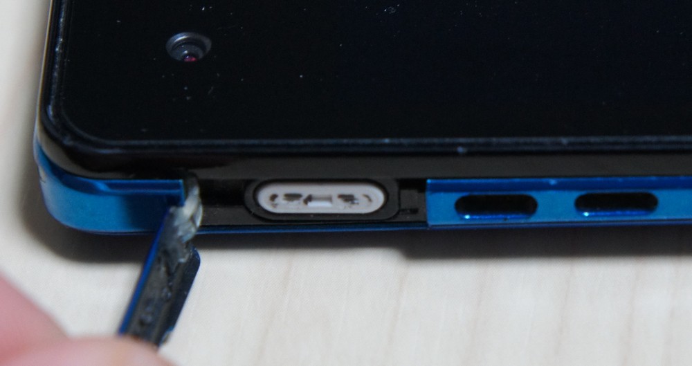 軽量っていうことで、実はメイン機種だったりする Xperia AX。充電しようと MicroUSB ケーブルを挿そうとしたら入らない・・・