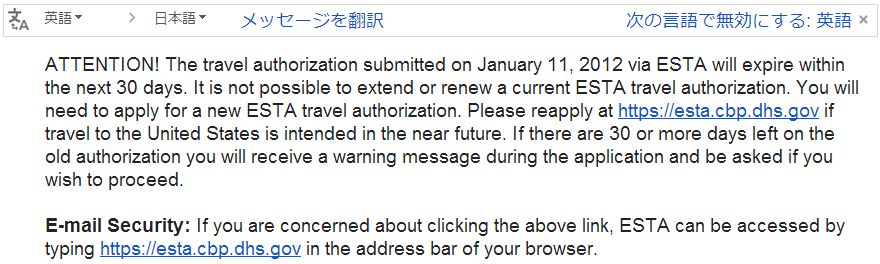 Posted in Travel, ひとりごと ESTA が切れました Author: 管理人 Published Date: 2013/12/22 Leave a Comment on ESTA が切れました すっかり忘れていたけど、最後の渡米からもう2年も経つんだなぁ・・・ ESTA が切れるよー、ってなメールが届きました。意外とちゃんとしたサービスになってるんですね。 そういえば、登録時にメアド登録したような・・・ GMail の翻訳機能が「使ってみて」って訴えてる感じがしたので(笑)、翻訳ボタンを押してみたら、結構まともな翻訳になるもんですね。 次回渡米時にはまた忘れないように申請しないとダメですなぁ・・・ Author: 管理人