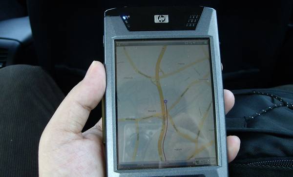 ホテルで預けた荷物を引きあげて、タクシーで空港まで。タクシーは約40ユーロ。お姉さんの運転はなかなか上手で荒くないです。せっかくなので、hx4700に仕込んだ地図でコースを確認。残念ながら地図の座標が10mほどずれています。まぁ、手作り地図にしては上出来か?