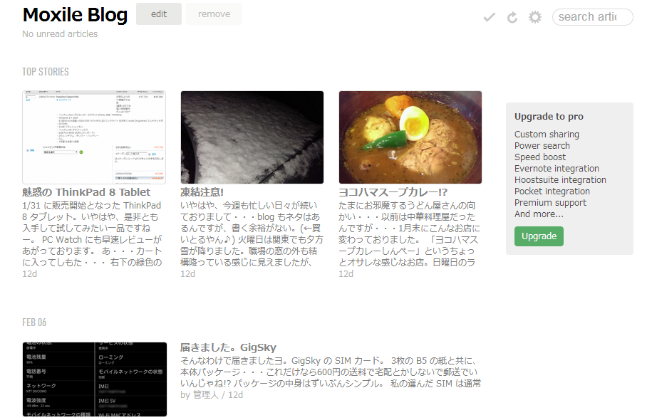 Posted in ひとりごと 本 blog の RSS が変なんです・・・ Author: 管理人 Published Date: 2014/02/19 Leave a Comment on 本 blog の RSS が変なんです・・・ なんだか最近、本 blog の RSS が Feedly に出てきません・・・ 見てみたところ、2/8 でストップしていますね・・・一応毎日更新してるんですけどねぇ・・・ 最近アクセス数が少ないのは、結構な人が RSS 使っている証拠ですかねぇ。 一応 Feed はちゃんと取得できている様子。 色々とぐぐってみたけど原因わからず。とりあえず WordPress をバージョンアップしてみました。 これで少し様子を見てみよう・・・ちゃんと原因を調べる時間が取れないんですヨ・・・ゴメンナサイ。 Author: 管理人