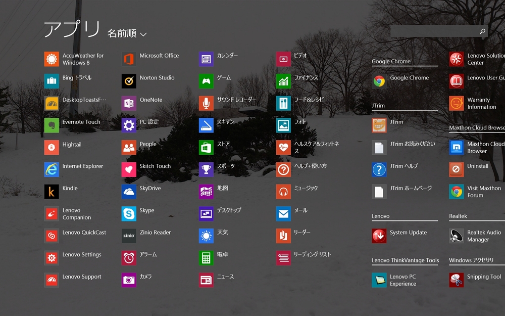 Metro 系なアプリもそれなりに入ってます。Office も付いてますが、まだシリアルキー入れてない(笑)。