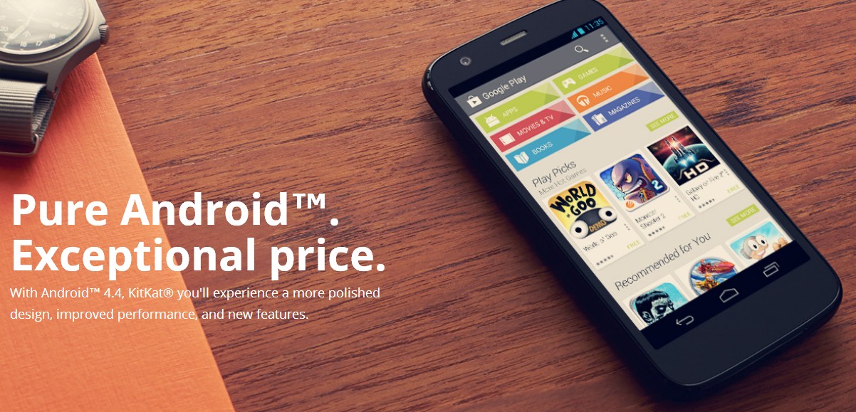 廉価なスマホ、Moto E です。4.3インチ960×540ピクセル、1.2GHzデュアルコアプロセッサ、1GB RAM、4GB ROM で MicroSD カードスロットも付いている。