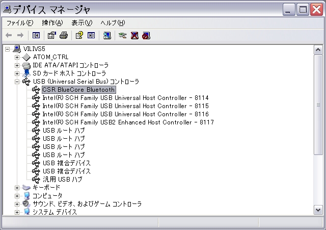 まず、デフォルト状態での BT Driver の状態。BT チップの CSR BlueCore のドライバが有効になっています。(既に XP は SP3 になっている状態でテストしています。)