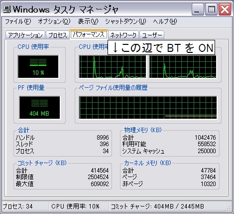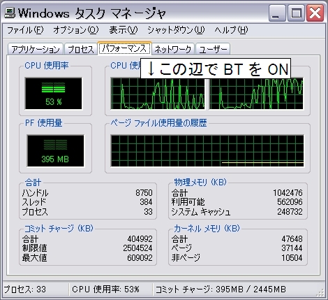 ここで BT を ON にすると、こんな感じで CPU 使用率がググっと上昇しちゃいます。