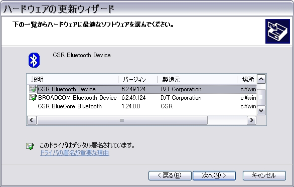 デバイスマネージャーから Bluetooth ドライバを選択し、ドライバの更新を実施。一覧から選択を選らんで、置き換えます。デフォルトでは上記キャプチャの一番下の CSR 製ドライバが使われていますが、IVT 製に置き換えます。