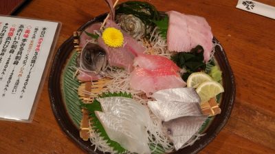 まずは本日のおすすめ5点盛り。地けんめ、天然ぶり、くろむつ、ひらめ、えぼだい。