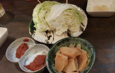 ビールを飲みつつ、そろそろ迫ってきた海外逃亡の計画を。串キャベツは130円とオトク。