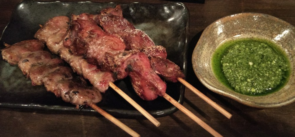 まずは臓物系から。ハツとレバー。バジルソースで味変できるという。