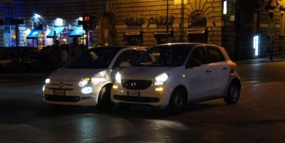 奥側の白いチンクが急に左折して橋に入ろうとして、左側にいた Smart に激突。CAR2GOのロゴがあるので、Smart はカーシェアの車ですかね・・・かわいそう。