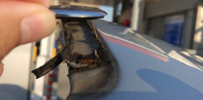 自然と腐食したのか、誰かが外そうとしたのかわかりませんが、ボンネットにねじ止めするためのステーが割れてしまっているようです。
