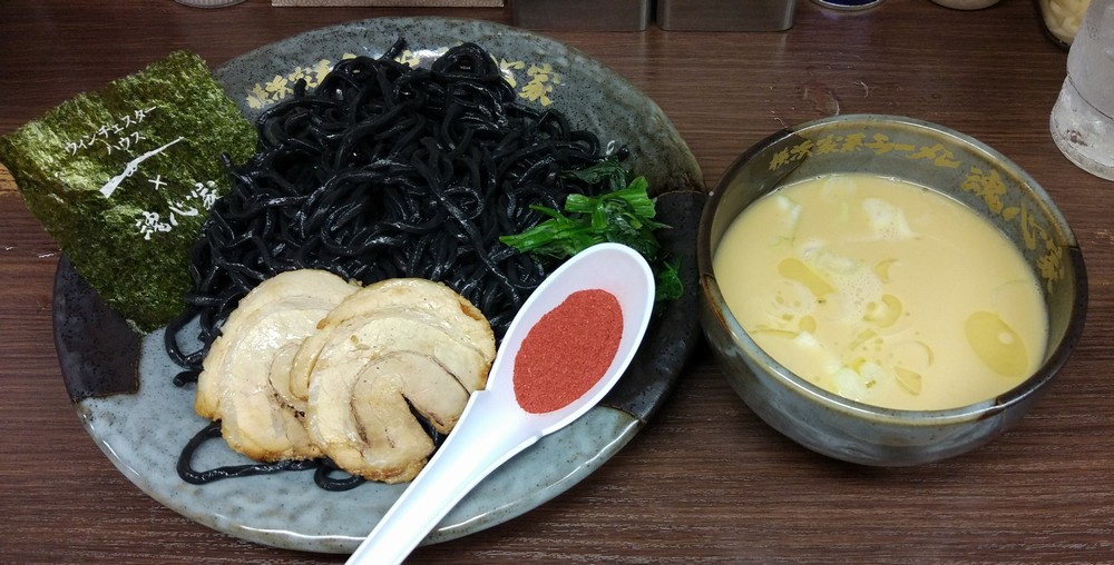 ご近所な魂心家は、時折訪れるのですが・・・なんか麺が真っ黒なつけ麺を期間限定で出していました。