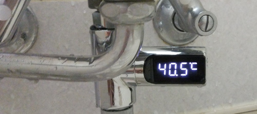 シャワーホースと水栓の間に装着。水を流すと・・・こんな感じで水温が表示されます♪